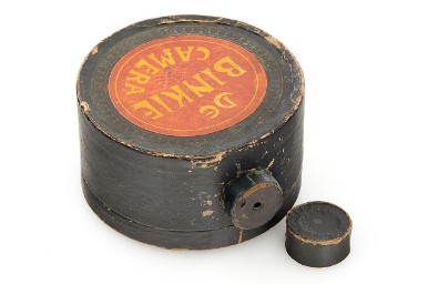 The Binkie is a cardboard camera with 5 glass plates 4x5 cm. The lens cap serves as shutter. The plates are moved into position by rotating the bottom.