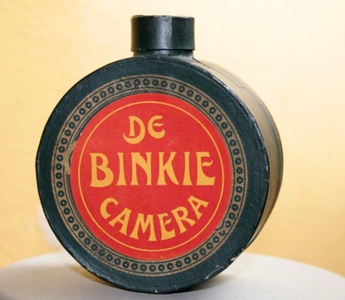 De Binkie is een kartonnen camera met 5 glasplaatjes van 4x5 cm. De lenskap dient als sluiter. De glasplaatjes worden in positie gedraaid door rotatie van de bodem.